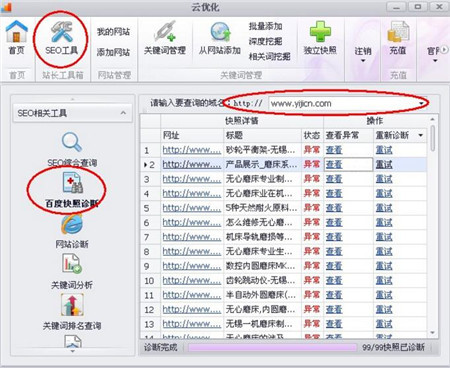 打開云優(yōu)化軟件-SEO工具-百度快照診斷功能,如圖