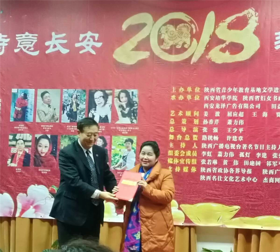 2018年1元月18日在西安培華學(xué)院新春詩會(huì)現(xiàn)場(chǎng)傳來好消息,鑒于愛心詩人孫香芹對(duì)陜西文學(xué)做出的突出貢獻(xiàn),培華學(xué)院研究決定《授予孫香芹西安培華學(xué)院“讀書大使”稱號(hào)》在詩歌與公益路上,孫香芹心懷感恩,無私奉獻(xiàn),用深情大愛關(guān)注留守兒童,回報(bào)社會(huì),以高度的社會(huì)責(zé)任感,堅(jiān)守一個(gè)詩人的良知,讓我們期待詩人的愛心公益之路越走越遠(yuǎn),也期待詩人踏歌長(zhǎng)安再創(chuàng)輝煌。