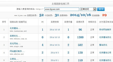 第二、交換鏈接主要看所交換的鏈接是否快照異常,快照異常的鏈接一般問題最大,快照異常主要原因是:百度對(duì)每個(gè)頁面收錄一次就會(huì)形成一個(gè)網(wǎng)頁快照。好比對(duì)網(wǎng)頁進(jìn)行拍照留存,那么快照形成的標(biāo)題、描述、關(guān)鍵詞、內(nèi)容都已經(jīng)是確定的了,當(dāng)用戶再更改標(biāo)題、描述、關(guān)鍵詞或內(nèi)容時(shí),快照內(nèi)容和網(wǎng)頁實(shí)際內(nèi)容就不一樣了。這樣就會(huì)產(chǎn)生快照異常,異常后關(guān)鍵詞排名就會(huì)不穩(wěn)定,關(guān)鍵詞下降或消失!關(guān)鍵詞異常更多詳情查看http://help.addpv.com/webseo/1349.html檢查該網(wǎng)站友情鏈接是否異常?http://www.youhuafenxi.com/LinkDetection/www.bjywx.com