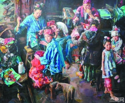 在展廳當(dāng)中,一組具有中國(guó)氣質(zhì)的畫作綻放著別具一格的魅力:有寫意的筆觸——謝非的《和諧·自然》,以點(diǎn)線面高度概括的形式、強(qiáng)烈的色彩對(duì)比及夸張的構(gòu)圖來謳歌大自然的和諧共存;有印象的描摹——石涌的《最后的歸宿》里,破舊的廠房、殘?jiān)珨啾诘拇u墻、報(bào)廢的汽車和散落的零件預(yù)示著社會(huì)的發(fā)展和變遷,而作者石涌用輕松寫意的筆法和薄厚對(duì)比的肌理,讓畫面?zhèn)鬟_(dá)出重生與希望的意境;亦有寫實(shí)的光影——黃平善的《苗家六月》里,柔和的傍晚暮色之中,一位美麗淳樸的苗家少女正在家中磨制豆腐,與古樸的木樓、經(jīng)歷歲月洗刷的器具融為一體,展現(xiàn)了獨(dú)具苗家韻味的原生態(tài)圖景。
