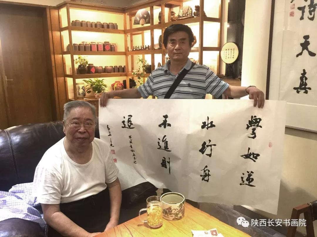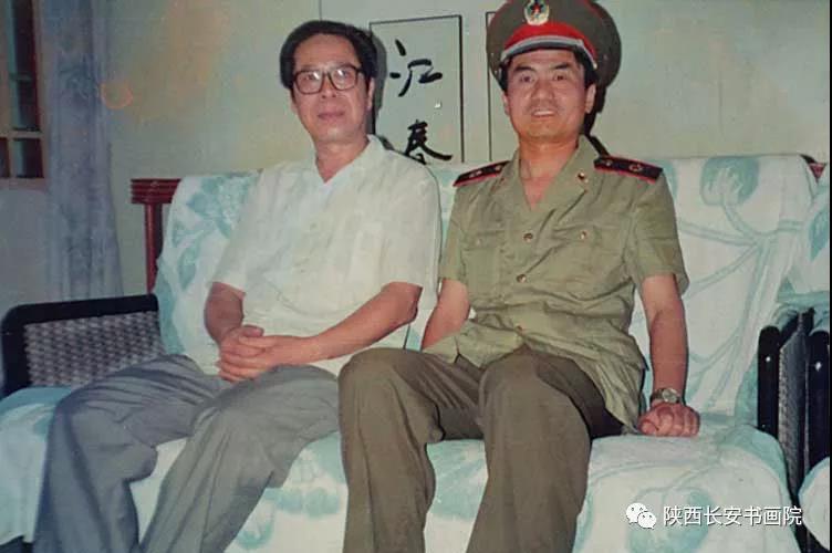 1987年我參加了中國(guó)書(shū)畫(huà)函授大學(xué)西安軍隊(duì)分校書(shū)法專(zhuān)業(yè)的學(xué)習(xí)。當(dāng)時(shí)西安的許多書(shū)法名家都給我們上過(guò)課。記得有一次吳三大先生在西安鐵一局大禮堂上完理論課,在觀眾席中央的案子上為大家表演示范時(shí),同學(xué)們忽啦一下子就圍攏了過(guò)來(lái),里三層外三層,人山人海,連座椅上都站滿(mǎn)了人,踮著腳尖向里看。站在外圍想看一眼吳先生寫(xiě)字時(shí)的風(fēng)采,是根本不可能的。當(dāng)時(shí)我就暗下決心,我也不和你們爭(zhēng),不和你們搶?zhuān)傆幸惶?,我要成為吳先生的弟子,一有空我就要站在他的身旁,整天目睹他?xiě)字的過(guò)程,一輩子看個(gè)夠。1990年6月,三年的書(shū)畫(huà)函授大學(xué)很快就畢業(yè)了,真草隸篆行各體甚至篆刻和裝裱我們都有涉獵,我們的確在這里學(xué)到了不少的東西。我因各門(mén)課程考試都在95分以上,所以還被評(píng)為全國(guó)總校級(jí)的優(yōu)秀畢業(yè)生。從此,我的書(shū)法臨帖也就都成了“天天練”了。1992年6月,我從蘭州軍區(qū)西安翠華路第二干休所的團(tuán)職崗位上即將轉(zhuǎn)業(yè)時(shí),我想穿上軍裝和吳先生再照一張合影,因?yàn)槲掖┥宪娧b他肯定印象深刻,他也是穿過(guò)軍裝的人。先一天我到東大街工藝美術(shù)商店給吳先生買(mǎi)了一套薄胎的景德鎮(zhèn)瓷器花瓶,送到西影路他的家中。但是很不湊巧,他不在家,他夫人王玉璋老師讓我過(guò)兩天去書(shū)院門(mén)的工作室找他。幾天后的一天,一大早我就趕到了吳先生的工作室等待他的到來(lái),直到十點(diǎn)多鐘,我看見(jiàn)一輛“皇冠”臥車(chē)開(kāi)過(guò)來(lái)時(shí),我心中的一塊石頭才算落了地,我想今天終于能見(jiàn)到吳先生了。見(jiàn)面后,我介紹了我的情況,說(shuō)明了我是他的崇拜者,也是書(shū)畫(huà)函授大學(xué)畢業(yè)的,馬上就要轉(zhuǎn)業(yè)了,想穿著軍裝和他照張像留個(gè)紀(jì)念,他滿(mǎn)口答應(yīng)。吳先生還毫不猶豫的給我寫(xiě)了一副四尺對(duì)聯(lián):“起筆錐畫(huà)沙,落墨屋漏痕”,他還給我解釋道:錐畫(huà)沙就是古人在裝滿(mǎn)細(xì)沙子的盆子里,用樹(shù)枝在上邊寫(xiě)字。屋漏痕就是很老的房子,一遇下雨,墻上便漏下了一股一股的泥水。沙子壘的不規(guī)則的道道和粗細(xì)不一的泥條條,這些都是古人寫(xiě)字時(shí)要的效果。他還說(shuō)“錐畫(huà)沙、屋漏痕”是他這幾年寫(xiě)字研究和追求的東西。